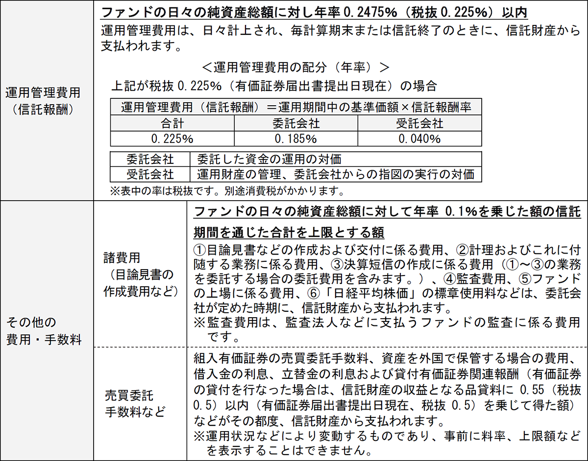 - 日経平均株価の採用銘柄の変更や資本異動などによってポートフォリオの調整が行なわれる場合、個別銘柄の売買などにあたりマーケット・インパクトを受ける可能性があること、また、信託報酬、売買委託手数料、監査費用などの費用をファンドが負担すること。