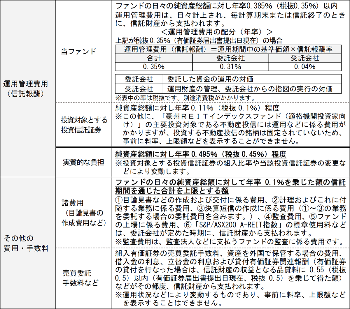 - S&P/ASX200 A-REIT指数の採用銘柄以外の銘柄に投資をすることがあること、S&P/ASX200 A-REIT指数の採用銘柄の変更や資本異動などによってポートフォリオの調整が行なわれる場合、個別銘柄の売買などにあたりマーケット・インパクトを受ける可能性があること、また、信託報酬、売買委託手数料、監査費用などの費用をファンドが負担すること。