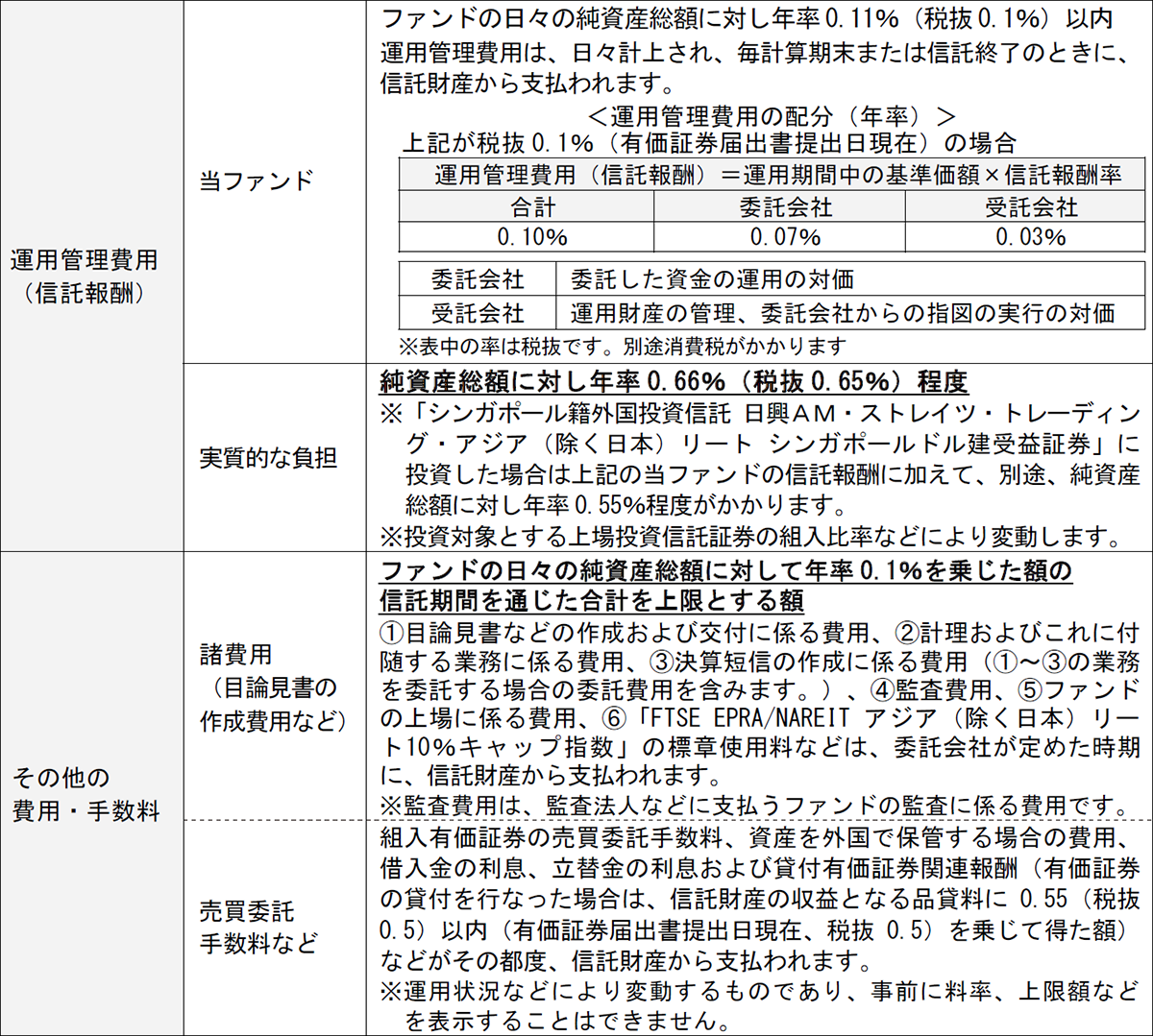 - 投資対象とするシンガポール籍外国投資信託 日興AM・ストレイツ・トレーディング・アジア(除く日本)リート*において、FTSE EPRA/NAREIT アジア(除く日本)リート10%キャップ指数の採用銘柄以外の銘柄に投資をすることがあること。FTSE EPRA/NAREIT アジア(除く日本)リート10%キャップ指数の採用銘柄の変更や資本異動などによってポートフォリオの調整が行なわれる場合、個別銘柄の売買などにあたりマーケット・インパクトを受ける可能性があること。また、信託報酬、売買委託手数料、監査費用などの費用を負担すること。
