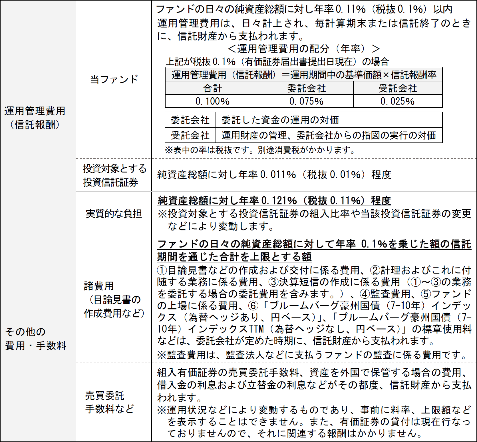 - ブルームバーグ豪州国債(7-10年)インデックスTTM(為替ヘッジなし、円ベース)の採用銘柄以外の銘柄に投資をすることがあること、ブルームバーグ豪州国債(7-10年)インデックスTTM(為替ヘッジなし、円ベース)の採用銘柄の変更や構成比率の変更などによってポートフォリオの調整が行なわれる場合、個別銘柄の売買などにあたりマーケット・インパクトを受ける可能性があること、また、信託報酬、売買委託手数料、監査費用などの費用をファンドが負担すること。