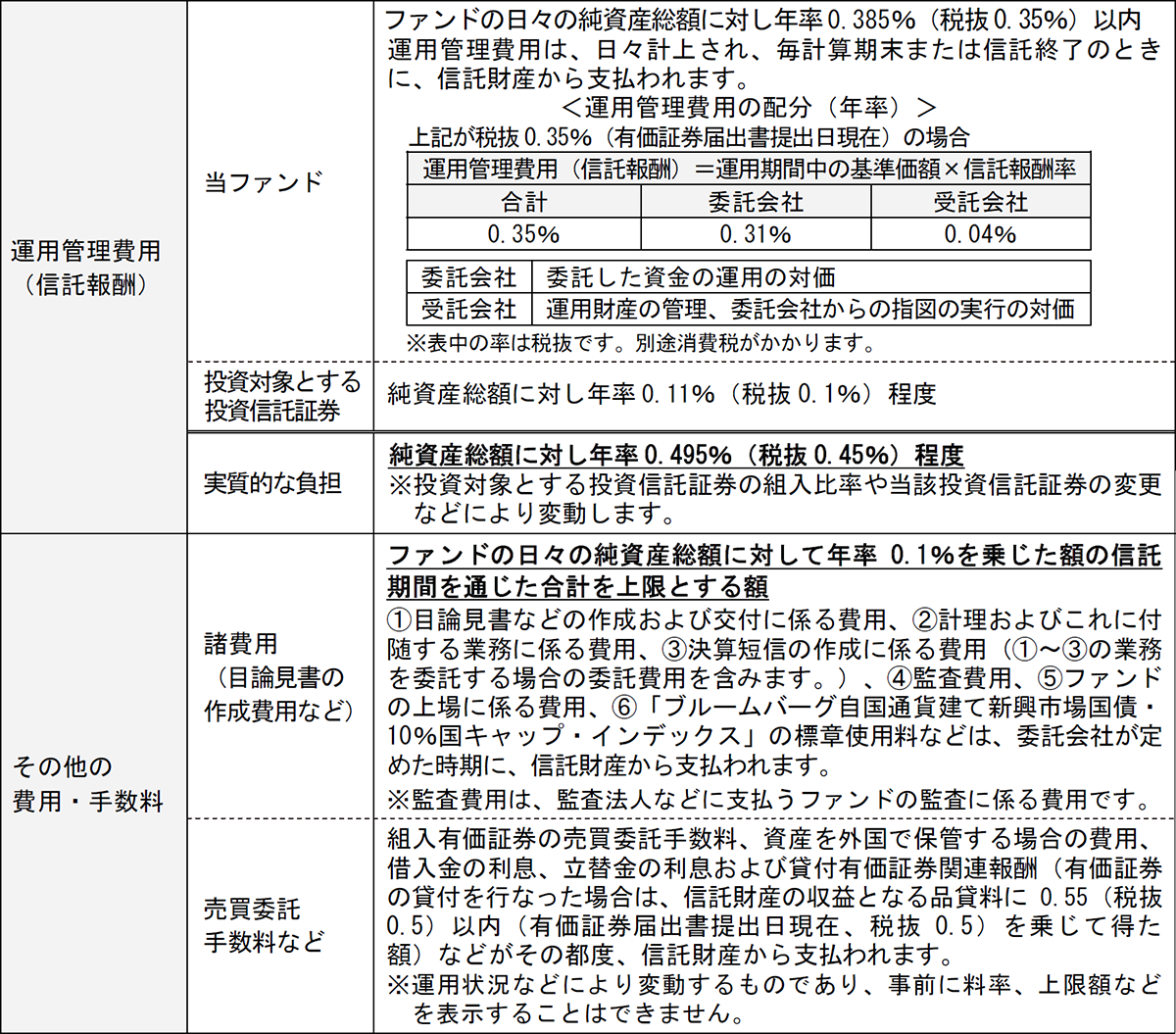 - ブルームバーグ自国通貨建て新興市場国債・10%国キャップ・インデックスの採用銘柄以外の銘柄に投資をすることがあること、ブルームバーグ自国通貨建て新興市場国債・10%国キャップ・インデックスの採用銘柄の変更や構成比率の変更などによってポートフォリオの調整が行なわれる場合、個別銘柄の売買などにあたりマーケット・インパクトを受ける可能性があること、また、信託報酬、売買委託手数料、監査費用などの費用をファンドが負担すること。