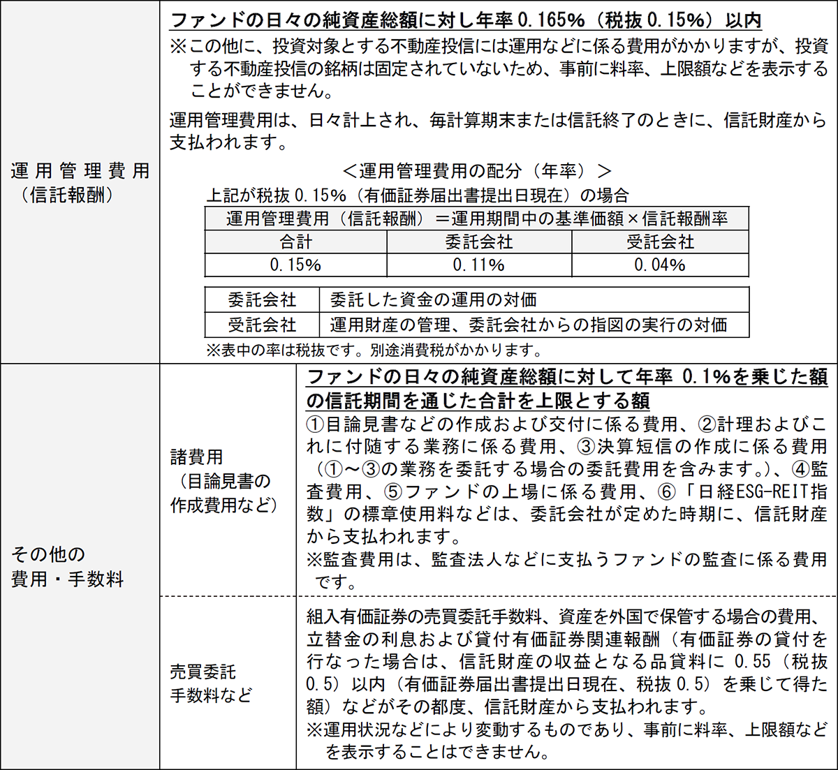 - 日経ESG-REIT指数の採用銘柄の変更や資本異動などによってポートフォリオの調整が行なわれる場合、個別銘柄の売買などにあたりマーケット・インパクトを受ける可能性があること、また、信託報酬・売買委託手数料、監査費用などの費用をファンドが負担すること。