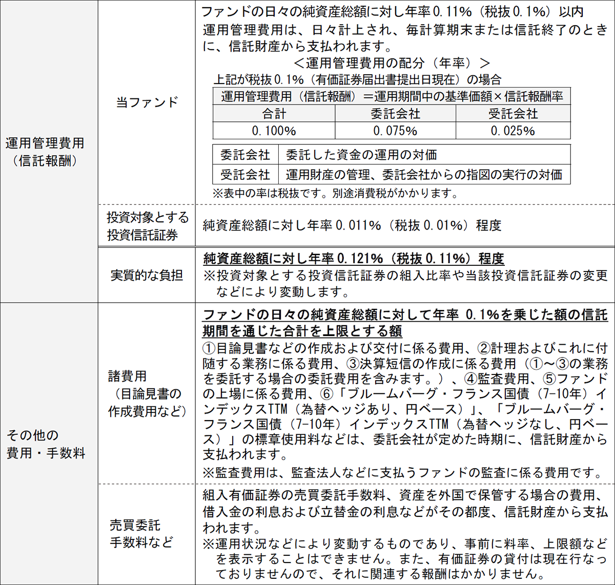 - ブルームバーグ・フランス国債(7-10年)インデックスTTM(為替ヘッジあり、円ベース)の採用銘柄以外の銘柄に投資をすることがあること、ブルームバーグ・フランス国債(7-10年)インデックスTTM(為替ヘッジあり、円ベース)の採用銘柄の変更や構成比率の変更な どによってポートフォリオの調整が行なわれる場合、個別銘柄の売買などにあたりマーケット・インパクトを受ける可能性があること、また、信託報酬、売買委託手数料、監査費用などの費用をファンドが負担すること。