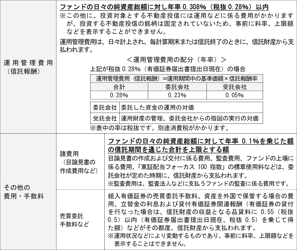 - 東証配当フォーカス100 指数の採用銘柄の変更や資本異動などによってポートフォリオの調整が行なわれる場合、個別銘柄の売買などにあたりマーケット・インパクトを受ける可能性があること、また、信託報酬・売買委託手数料、監査費用などの費用をファンドが負担すること。