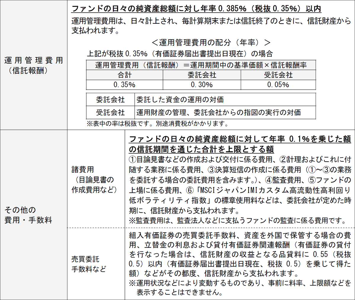 - MSCIジャパンIMIカスタム高流動性高利回り低ボラティリティ指数の採用銘柄の変更や資本異動などによってポートフォリオの調整が行なわれる場合、個別銘柄の売買などにあたりマーケット・インパクトを受ける可能性があること、また、信託報酬、売買委託手数料、監査費用などの費用をファンドが負担すること。