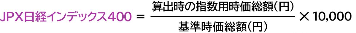 JPX日経インデックス400は、東京証券取引所のプライム市場、スタンダード市場、グロース市場を主たる市場とする普通株式を母集団とし、①適格基準・市場流動性指標によるスクリーニング、②定量的な指標(3年平均ROE、3年累積営業利益、時価総額)によるスコアリング、③定性的な要素(独立した社外取締役の選任、IFRSの採用、決算情報の英文開示)を加点したスコアリングを経て選定した400銘柄からなる株価指数です。算出方法は、基準時を2013年8月30日(終値)に置き、その日の時価総額を10,000として、その後の時価総額を指数化したものです。