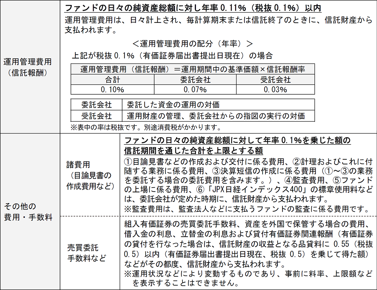 - JPX日経インデックス400の採用銘柄の変更や資本異動などによってポートフォリオの調整が行なわれる場合、個別銘柄の売買などにあたりマーケット・インパクトを受ける可能性があること、また、信託報酬、売買委託手数料、監査費用などの費用をファンドが負担すること。
