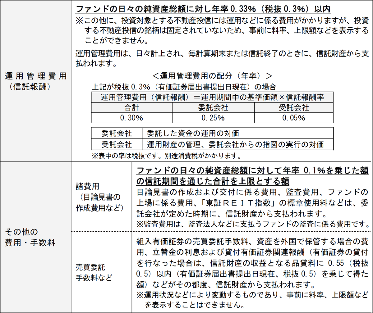 - 東証REIT指数の採用銘柄の変更や資本異動などによってポートフォリオの調整が行なわれる場合、個別銘柄の売買などにあたりマーケット・インパクトを受ける可能性があること、また、信託報酬・売買委託手数料、監査費用などの費用をファンドが負担すること。