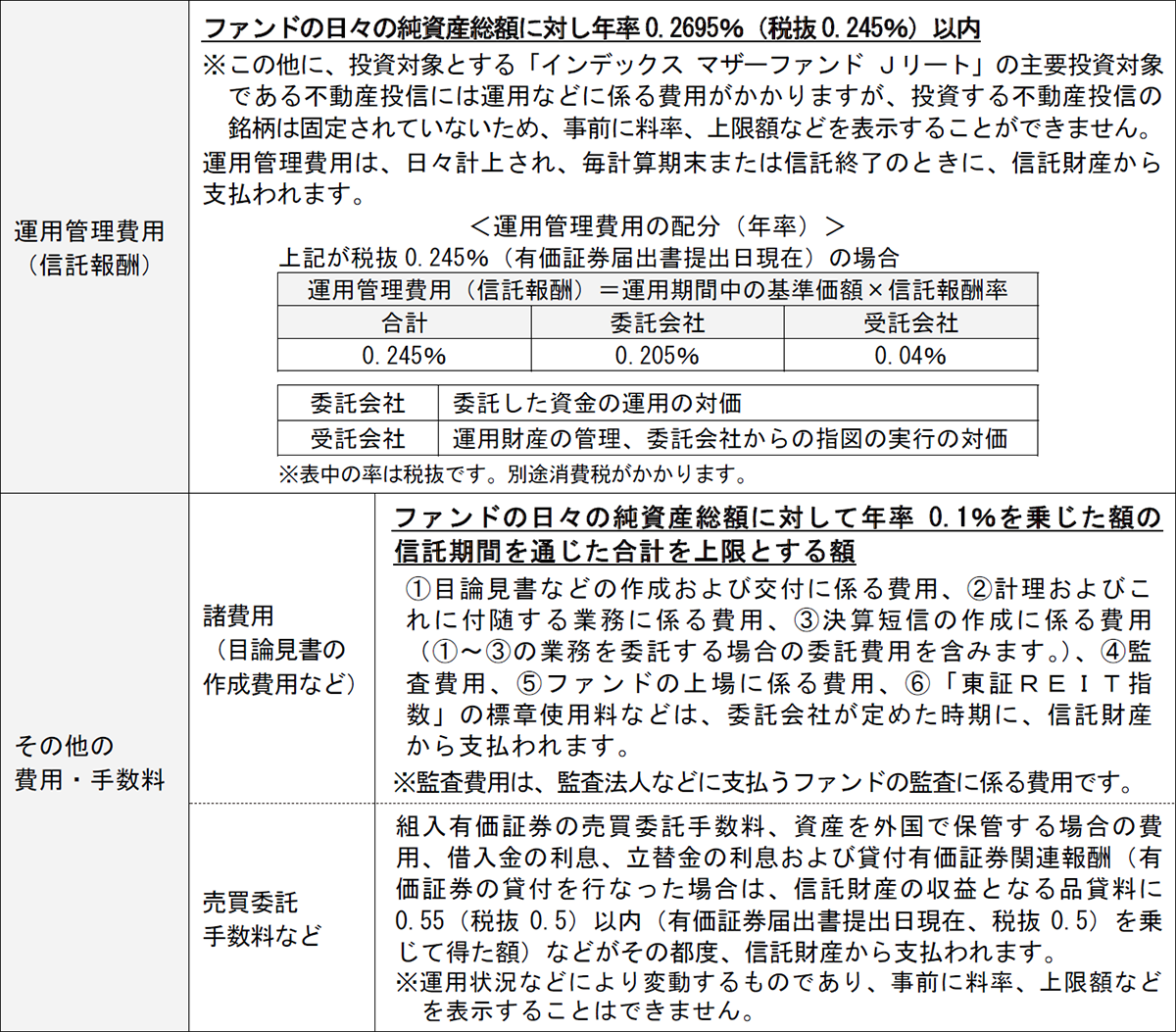 - 東証REIT指数の採用銘柄の変更や資本異動などによってポートフォリオの調整が行なわれる場合、個別銘柄の売買などにあたりマーケット・インパクトを受ける可能性があること、また、信託報酬・売買委託手数料、監査費用などの費用をファンドが負担すること。