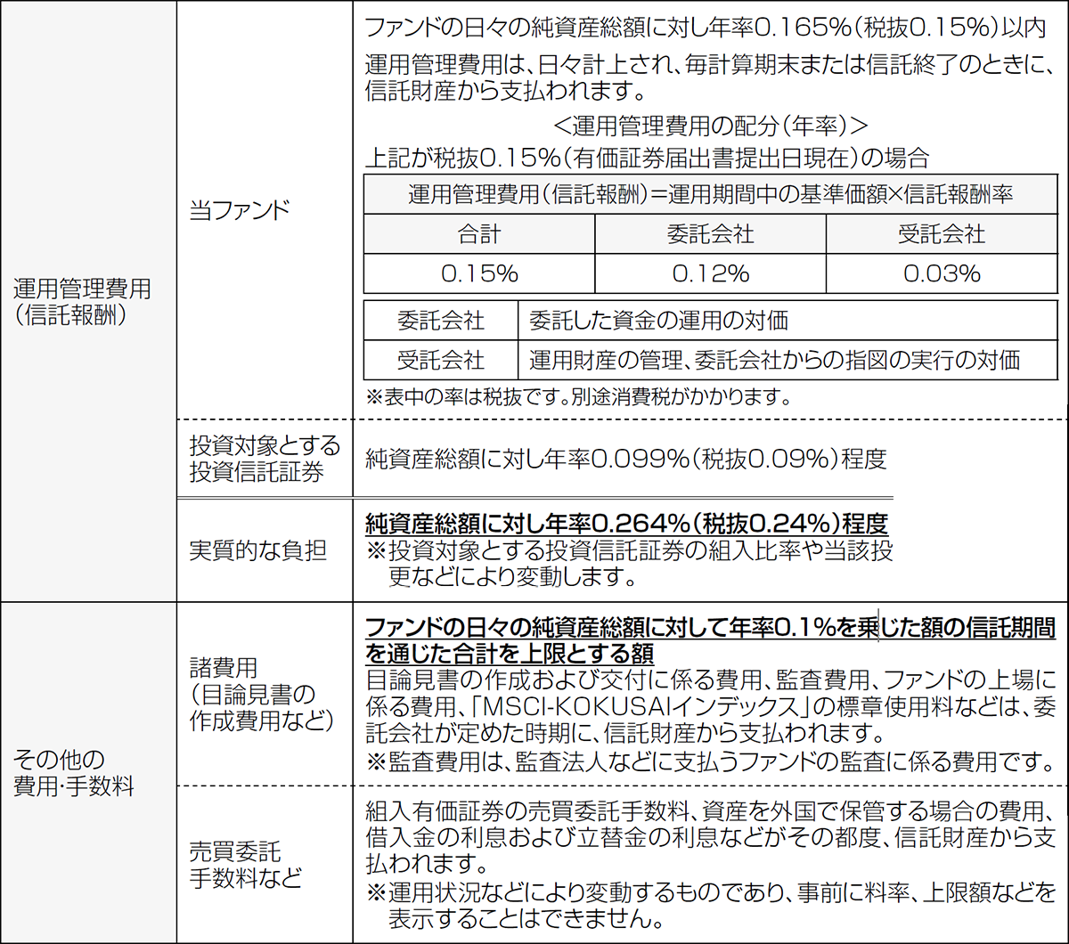 - MSCI-KOKUSAI インデックスの採用銘柄以外の銘柄に投資をすることがあること、MSCIKOKUSAIインデックスの採用銘柄の変更や資本異動などによってポートフォリオの調整が行なわれる場合、個別銘柄の売買などにあたりマーケット・インパクトを受ける可能性があること、また、信託報酬、売買委託手数料、監査費用などの費用をファンドが負担すること。
