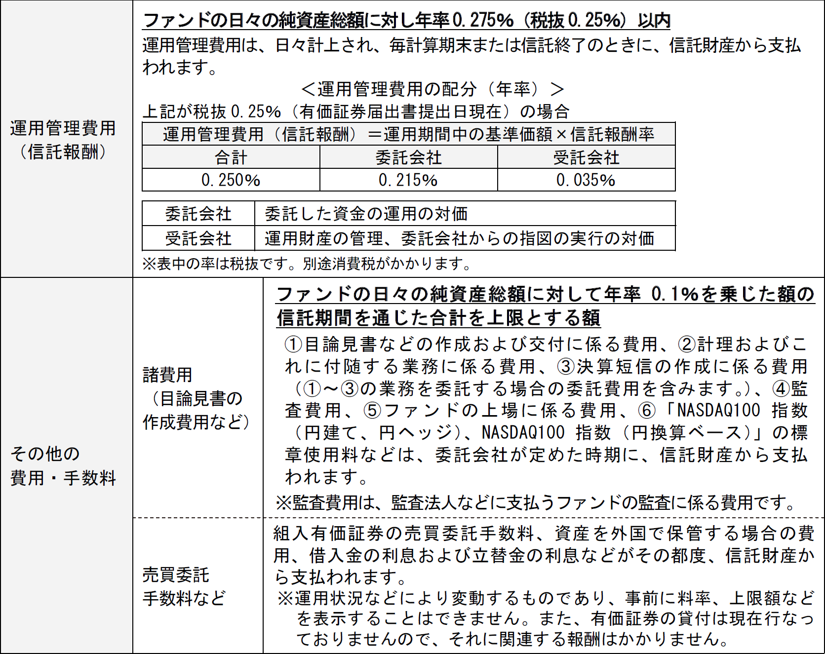 - NASDAQ100指数(円換算ベース)の採用銘柄以外の銘柄に投資をすることがあること、NASDAQ100指数(円換算ベース)の採用銘柄の変更や資本異動などによってポートフォリオの調整が行なわれる場合、個別銘柄の売買などにあたりマーケット・インパクトを受ける可能性があること、また、信託報酬、売買委託手数料、監査費用などの費用をファンドが負担すること。