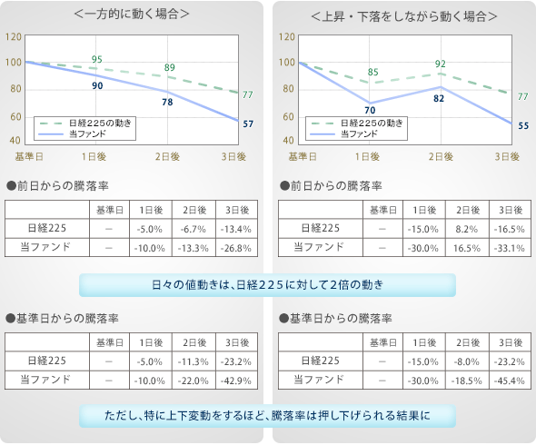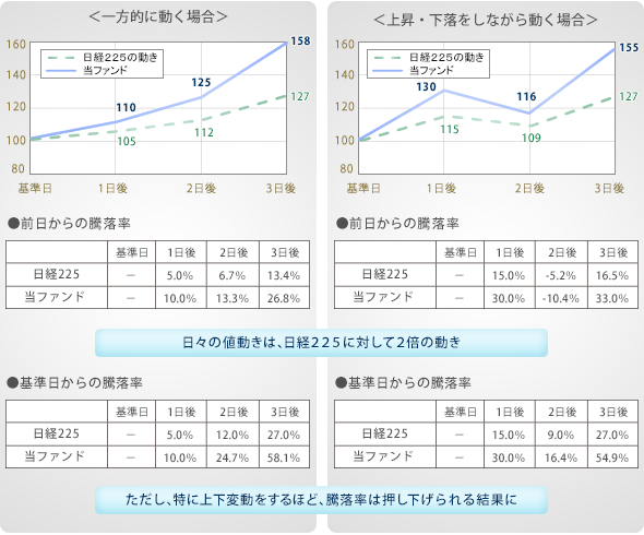 - 投資家ごとのファンド保有期間中の投資成果は、日々の基準価額の値動きが日経225の値動きの2倍の動きをした場合であっても、2日以上離れた日との比較においては、2倍の投資成果を得られるわけではありません。