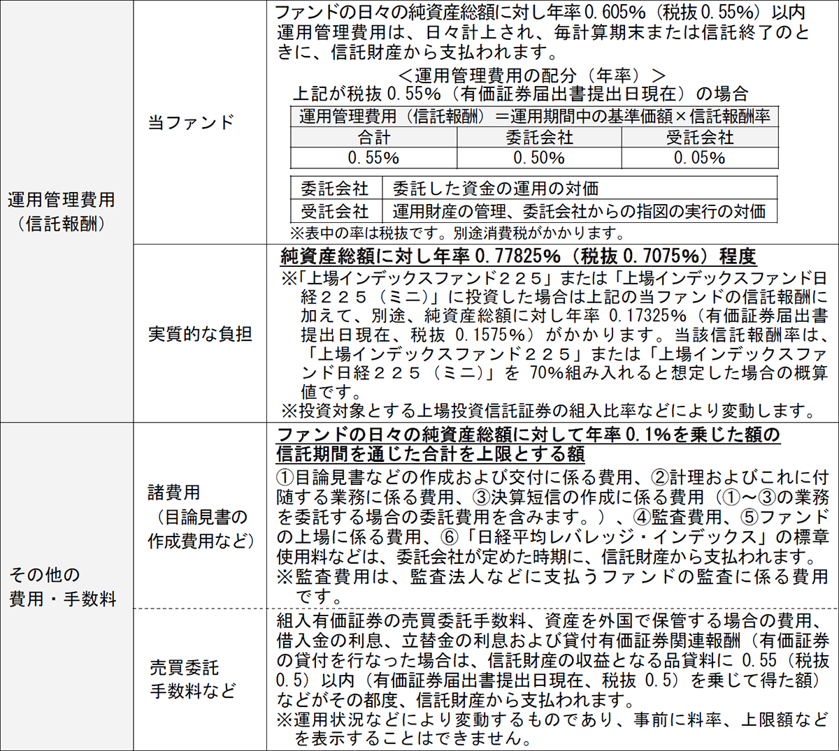- 日経平均株価の採用銘柄の変更や資本異動などによってポートフォリオの調整が行なわれる場合、個別銘柄の売買などにあたりマーケット・インパクトを受ける可能性があること、また、信託報酬、売買委託手数料、監査費用などの費用をファンドが負担すること。