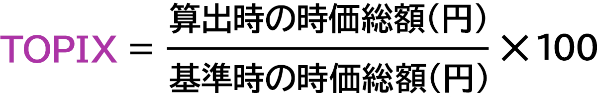 TOPIX(東証株価指数)は、日本の株式市場を広範に網羅するとともに、投資対象としての機能性を有するマーケット・ベンチマークで、指数採用銘柄の浮動株調整後の時価総額を指数として算出します。算出方法は、基準時を昭和43年(1968年)1月4日(終値)に置き、その日の時価総額を100として、その後の時価総額を指数化したものです。