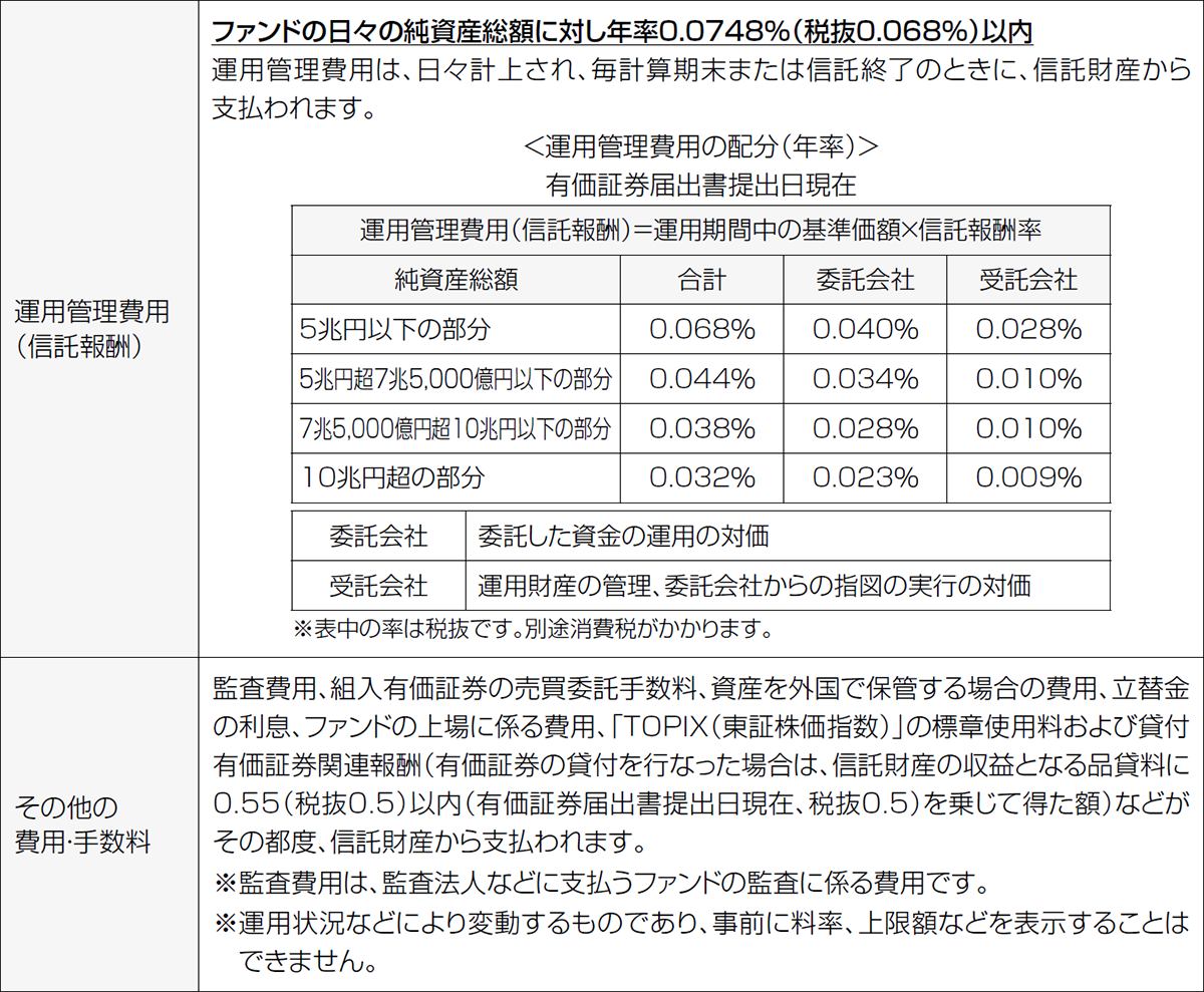 - TOPIX(東証株価指数)の採用銘柄の変更や資本異動などによってポートフォリオの調整が行なわれる場合、個別銘柄の売買などにあたりマーケット・インパクトを受ける可能性があること、また、信託報酬、売買委託手数料、監査費用などの費用をファンドが負担すること。