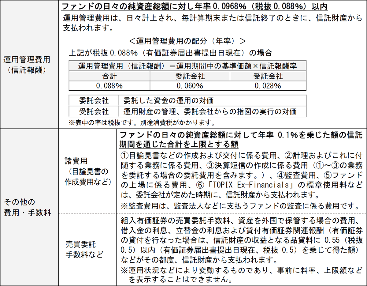 - TOPIX Ex-Financialsの採用銘柄の変更や資本異動などによってポートフォリオの調整が行なわれる場合、個別銘柄の売買などにあたりマーケット・インパクトを受ける可能性があること、また、信託報酬、売買委託手数料、監査費用などの費用をファンドが負担すること。