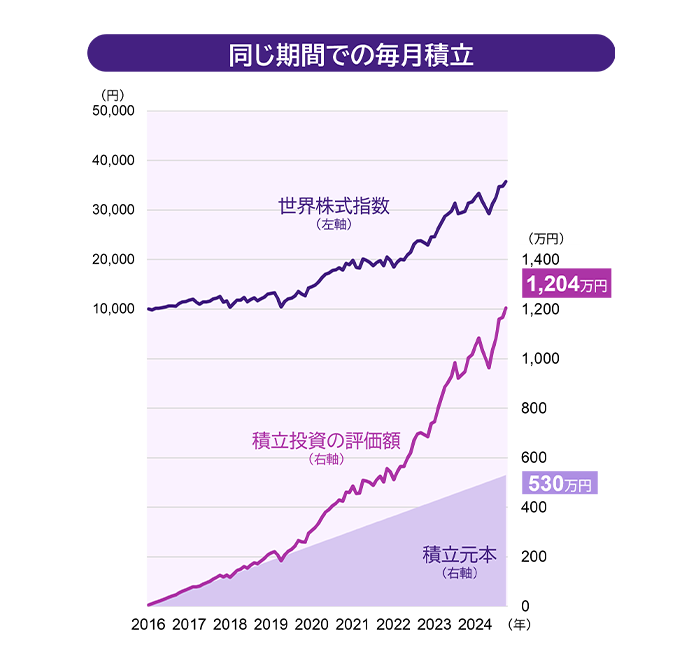 「世界株式指数」はMSCIワールド指数(税引後配当込み、米ドルベース)をアモーヴァ・アセットマネジメントが円換算。グラフ起点を10,000円として指数化。なお、基準価額の算出方法に対応させるため、前営業日の値に当日の為替を適用して算出。上記指数は当ファンドのベンチマークではありません。上記は過去のものであり、将来の運用成果等を約束するものではありません。積立投資が必ず利益があがると保証するものではありません。指数の著作権等の知的財産権その他一切の権利は、各指数の算出元または公表元に帰属します。