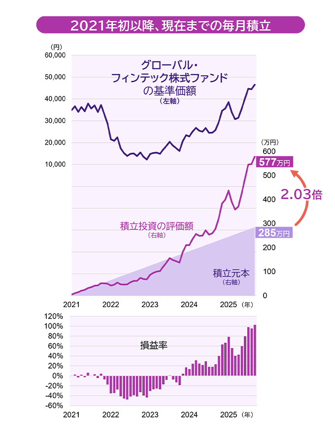 波乱万丈な値動きの「グローバル・フィンテック株式ファンド」への2021年からの私自身の積立投資を振り返ってきました。