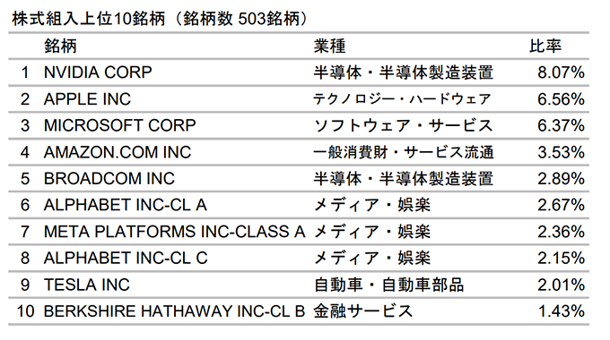 上記はあくまで指数の概要を把握することを目的に、S&P500指数を連動対象としたあるインデックスファンドの情報を参考までに掲載したものです。上記銘柄について、売買を推奨するものでも、将来の価格の上昇または下落を示唆するものでもありません。また、当社ファンドにおける保有・非保有および将来の銘柄の組入れまたは売却を示唆・保証するものでもありません。上記は過去のものであり、将来の運用成果を約束するものではありません。比率はマザーファンドの対純資産です。