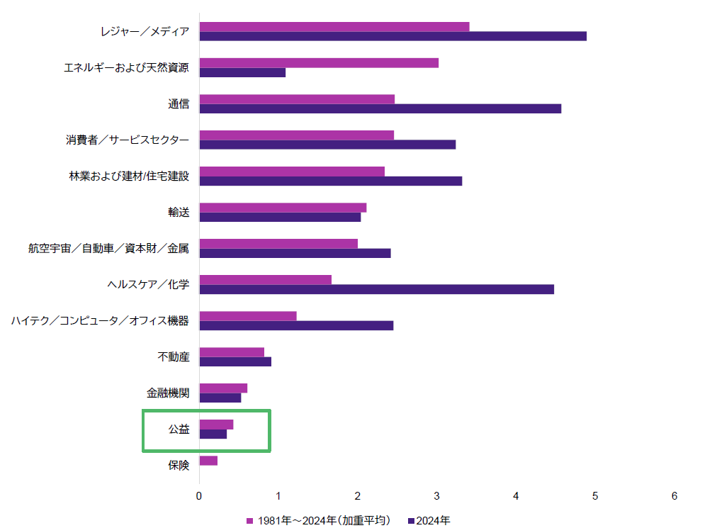 より幅広い観点から見ると、グリーンボンドは、AIと脱炭素化の両方を支えるインフラへ資本を振り向けるための、効果的な手段となっている。グリーンボンドは、投資家にとっては資金使途の透明性が高く、発行体にとっては調達コストの低減につながり、世界の電力システムが今まさに必要としている再生可能エネルギー容量の拡大を後押ししている。また、公益事業セクターはデフォルト率が低く(チャート4参照)、長期的な収益の可視性も高いことから、世界のクレジット市場において引き続き最も安定したセクターの1つとなっている。そのため、同セクターはグリーンボンドを通じた大規模な再生可能エネルギープロジェクトの資金調達に適しており、投資家にとってもキャッシュフローを見通しやすく、社会に不可欠なインフラへのエクスポージャーを取ることが可能となる。