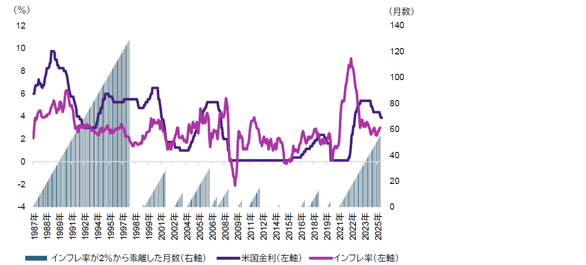 ポートフォリオを構成するディフェンシブ資産の側においても、同様の問題が見通しを曇らせている。トランプ大統領がFRBに利下げを迫っているものの、慎重な対応が求められる経済情勢下にあるためだ。インフレは予想以上に根強い状況にある。コモディティ相場の再上昇や関税を受けた値上げ、米国政府の財政赤字が対GDP比約6%にのぼることを考慮すると、インフレが本当に収束したのか疑問視するのが妥当だろう。チャート3が示すように、インフレ率がFRBの2%目標から乖離してきた期間は55ヵ月となり、インフレが従来考えられていたほど一時的ではない可能性が示唆されている。これほどのインフレ率の高止まりは1990年代半ば以降みられていない。当時、実質金利はITバブル崩壊まで引き締め的な水準での推移が続いていた。