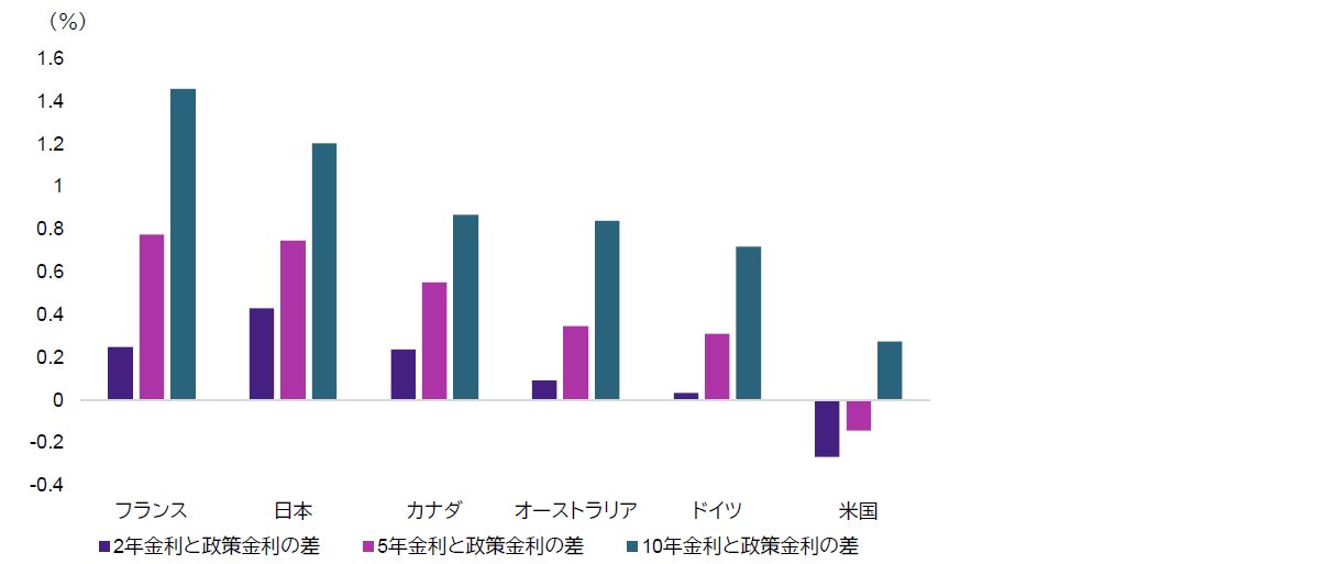 また、米国外では複数の主要中央銀行が追加緩和の一時停止段階に達しつつあるようだ。足元の市場では、カナダ、ユーロ圏、オーストラリア、ニュージーランドの政策金利が12ヵ月先まで据え置かれるとの見方が織り込まれており、利下げが織り込まれているのは英国と米国だけだ。世界的に金融環境が緩和されて景気を支える見通しではあるものの、FRBの利下げ期待が見直される展開となれば世界の金利市場に悪影響を及ぼすだろう。当社では引き続き、今後6~12ヵ月間のインフレ加速リスクに備えて、イールドカーブがスティープ化している国の中期ゾーンの債券に注目しており、現在はカナダや日本などの国に焦点を当てている。