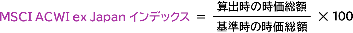 MSCI ACWI ex Japanインデックスは、MSCI Inc.が開発した株式インデックスで、日本を除く世界の先進国・新興国の株式の総合投資収益を各市場の時価総額比率で加重平均し、指数化したものです。