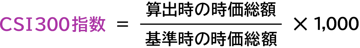 CSI300指数は、上海証券取引所(中国語名称「上海証券交易所」)および深セン証券取引所(中国語名称「深セン証券交易所」)に上場されている全A株のうち、時価総額および流動性の高い300銘柄で構成されており、中国の株価を代表する指数です。指数の算出方法は、浮動株比率を調整した時価総額加重平均方式です。基準時を2004年12月31日とし、その日の時価総額を1,000として、その後の時価総額を指数化したものです。