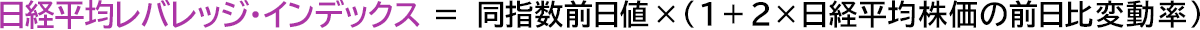 - 日経平均レバレッジ・インデックスは、前営業日に対する当該営業日の騰落率が、同期間の日経平均株価の騰落率の2倍となるよう計算されます。しかしながら、2営業日以上離れた期間における日経平均レバレッジ・インデックスの騰落率は、複利効果により、一般に日経平均株価の2倍とはならず、計算上、差が生じます。