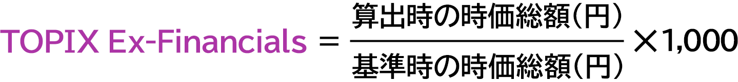 TOPIX Ex-Financialsは、TOPIX(東証株価指数)の算出対象銘柄の中から、「保険業」、「銀行業」、「証券、商品先物取引業」、および「その他金融業」の業種に属する銘柄を除いた銘柄を対象に、浮動株調整後の時価総額を指数として算出します。 TOPIX Ex-Financialsは、基準時を平成5年(1993年)7月5日(終値)に置き、その日の時価総額を1,000ポイントとして算出します。 業種の分類には、「証券コード協議会が定める33業種」を用います。