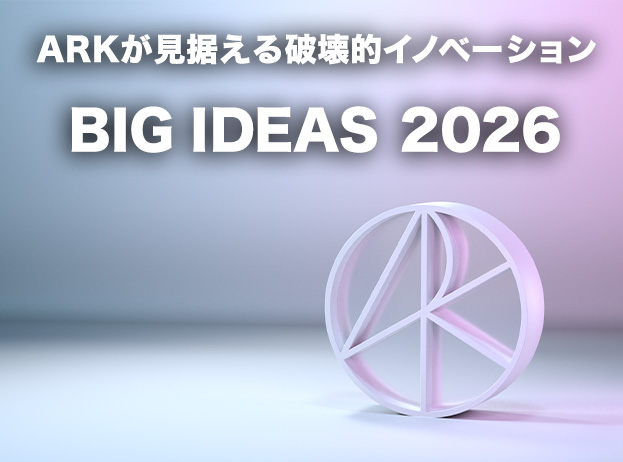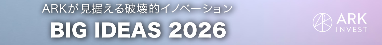 ARKでは、ブレイクスルー・テクノロジーのもたらす影響を投資家の皆様にご紹介するため、2017年より「Big Ideas」を発行しています。記念すべき第10回目となる「Big Ideas 2026」では、世界経済を再構築するテクノロジーを特定し、その意味を読み解きます。人工知能、ロボティクス、エネルギー、ブロックチェーン、宇宙、バイオロジーなどの分野にまたがる「13のビッグアイデア」を取り上げ、これらの技術が融合しながら市場を変容させ、新たな成長機会を創出していく姿を提示します。ぜひ「Big Ideas 2026」をお楽しみください。