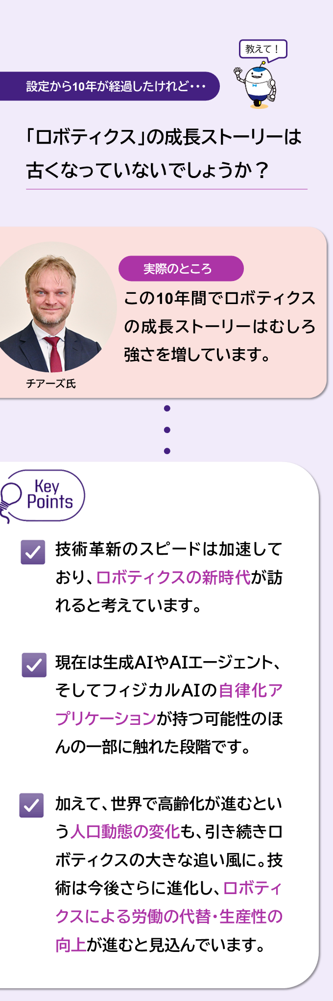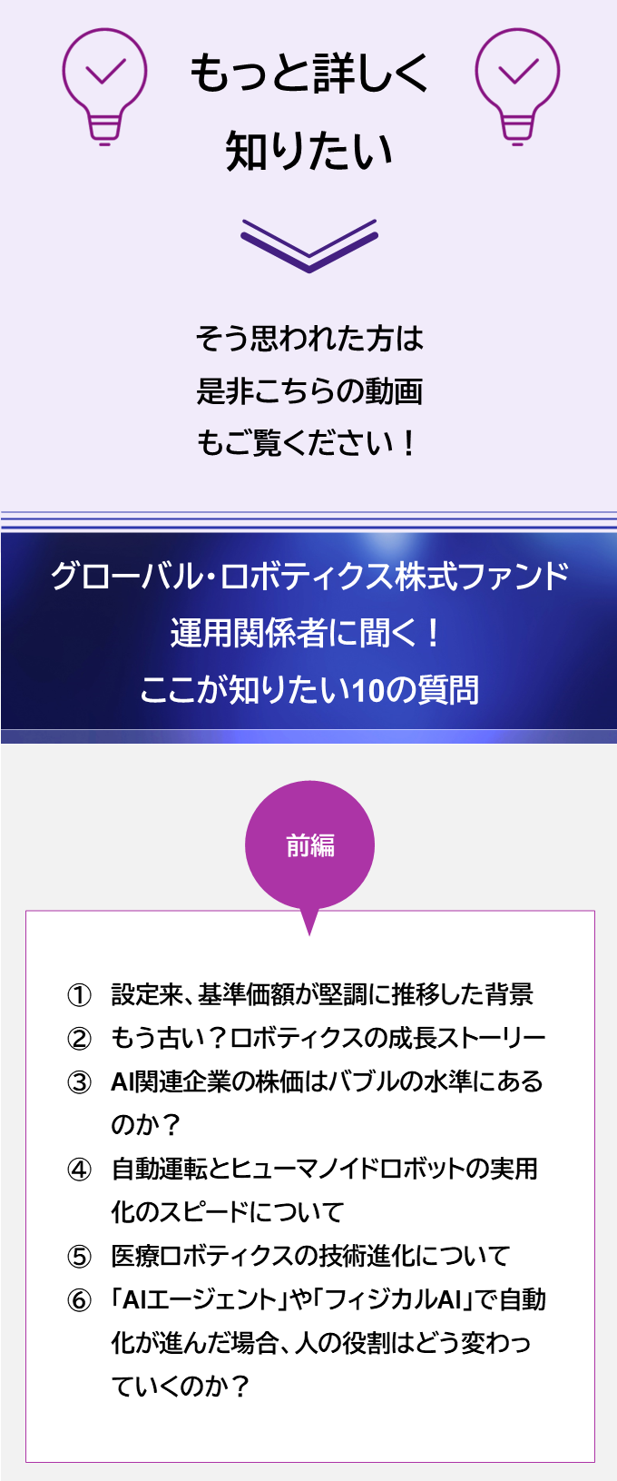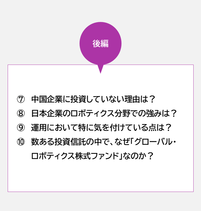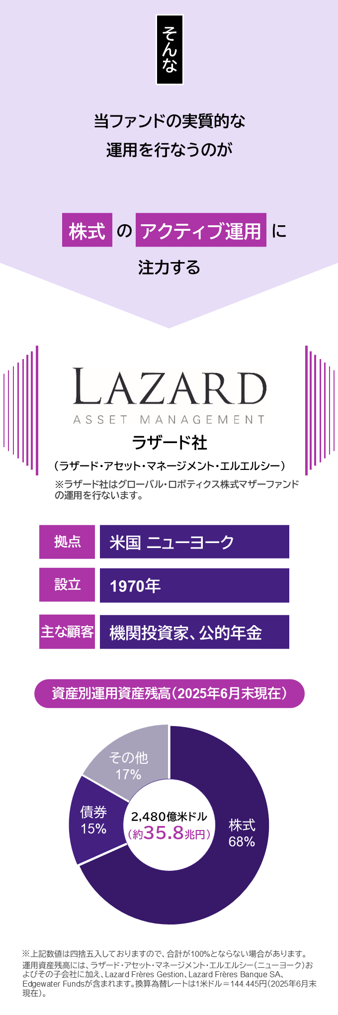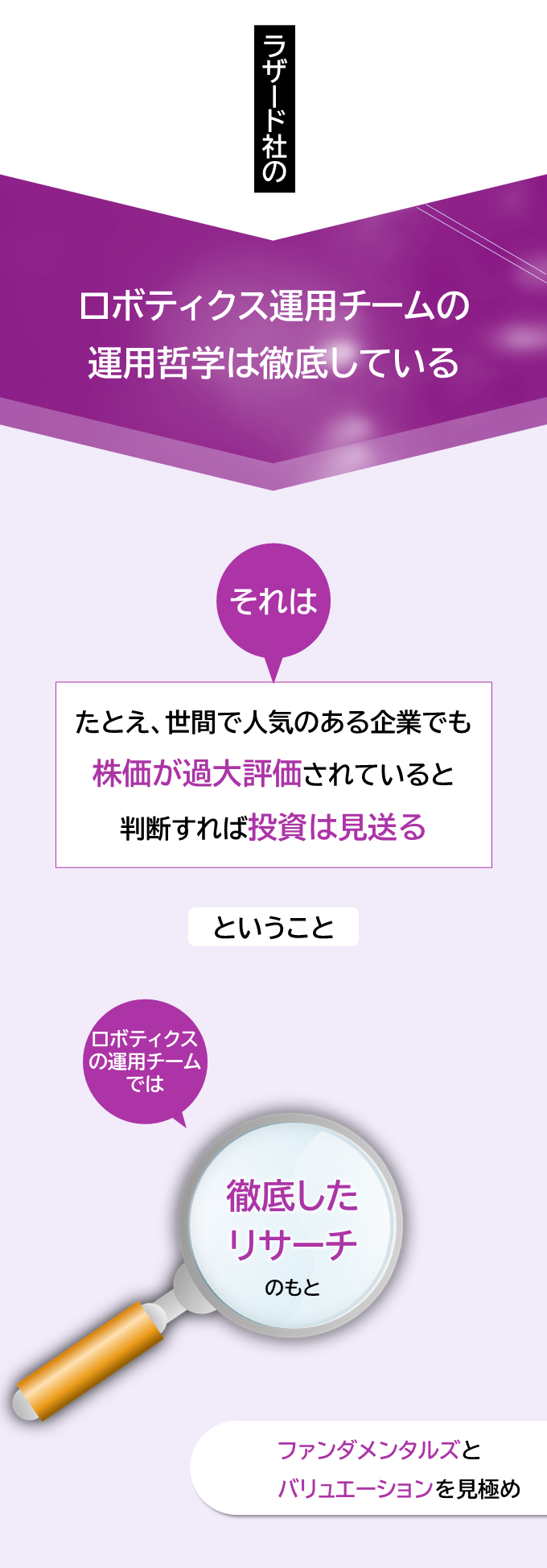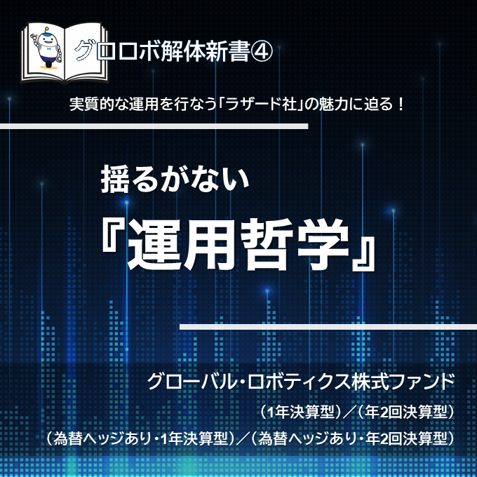 今回はラザード社のロボティクス運用チームの揺るがない「運用哲学」の魅力に迫るとともに、当ファンドの運用関係者の言葉を通じて、ロボティクスの成長分野の現在地、そして、その中で日本企業が果たす重要な役割などについてお伝えします。