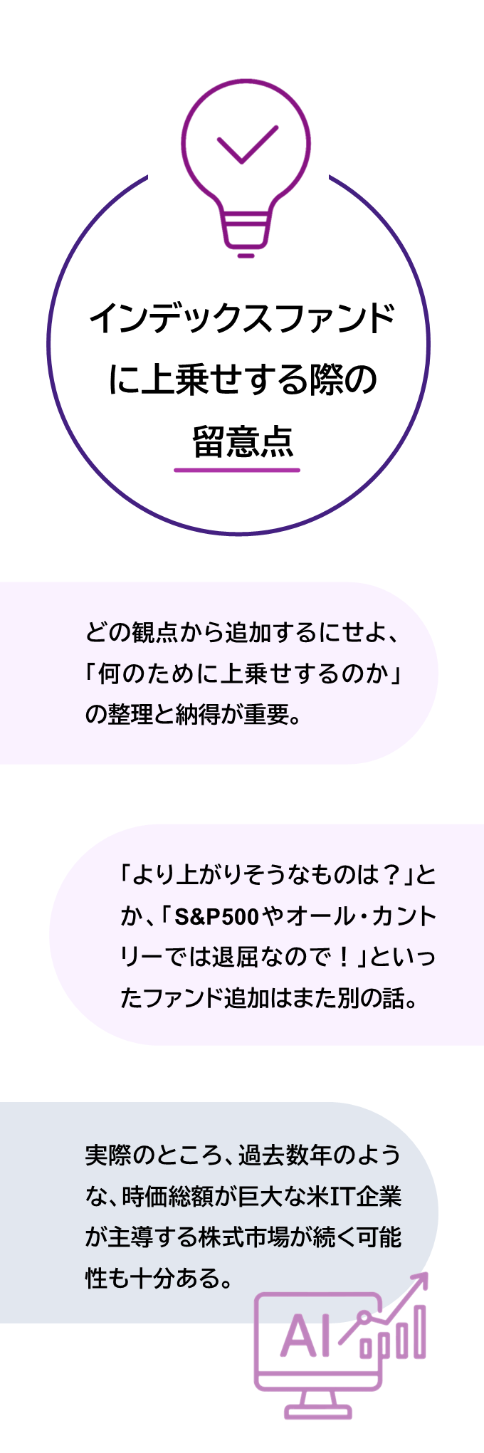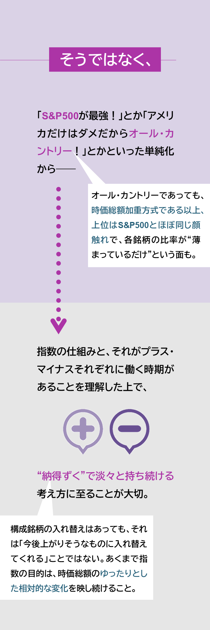 多くの方にとって、現在の方針を変える必要はないでしょう。しかし決して「妄信」ではなく、投資信託あるいは指数の仕組みへの理解と共に、「納得ずく」であることが必須だと、アモーヴァ・アセットは考えています。