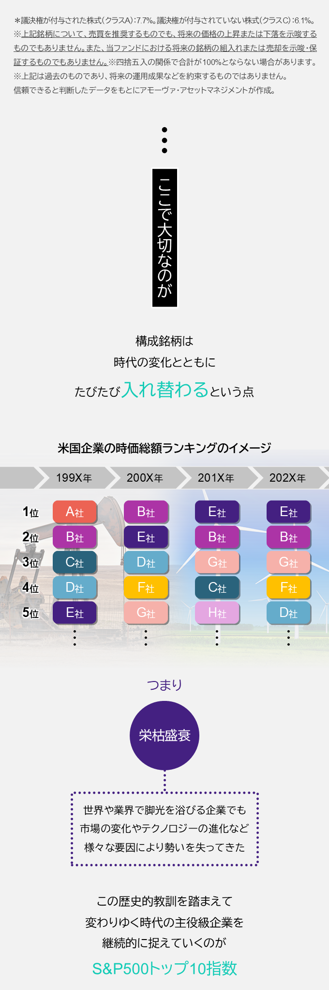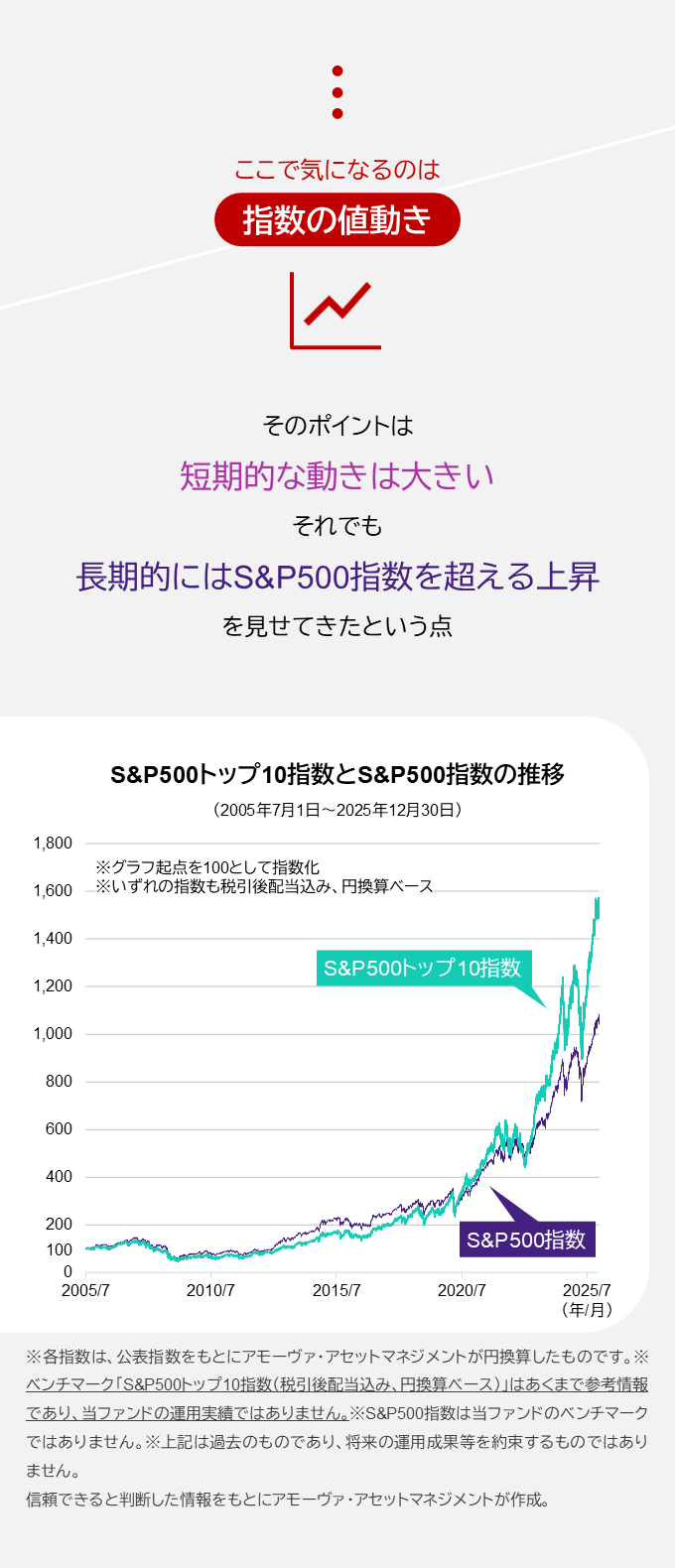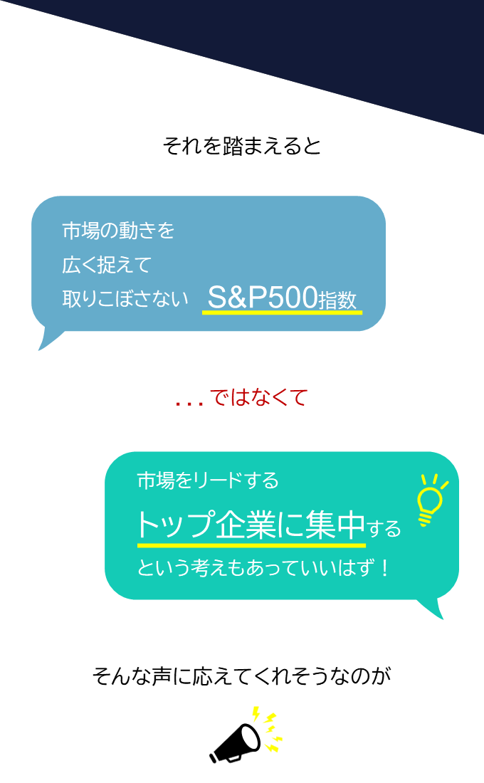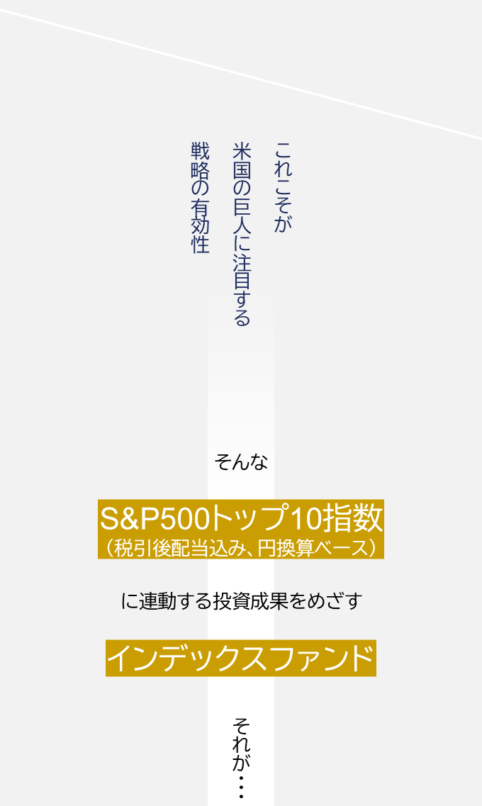 この事実を踏まえ、「米国株に投資するなら市場をリードする企業だけで十分」。そうした価値観に応えてくれるのがS&P500トップ10指数。この指数に連動することをめざすアモーヴァ・アセット(旧 日興アセット)のインデックスファンドこそ、あなたの欲しかった投資信託かもしれません。