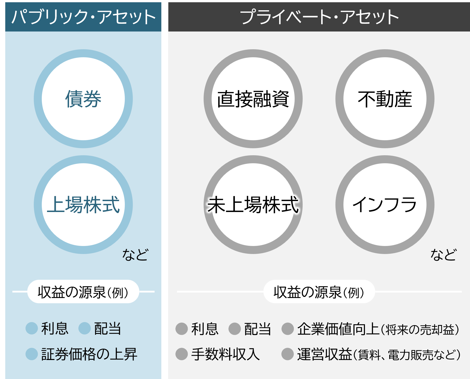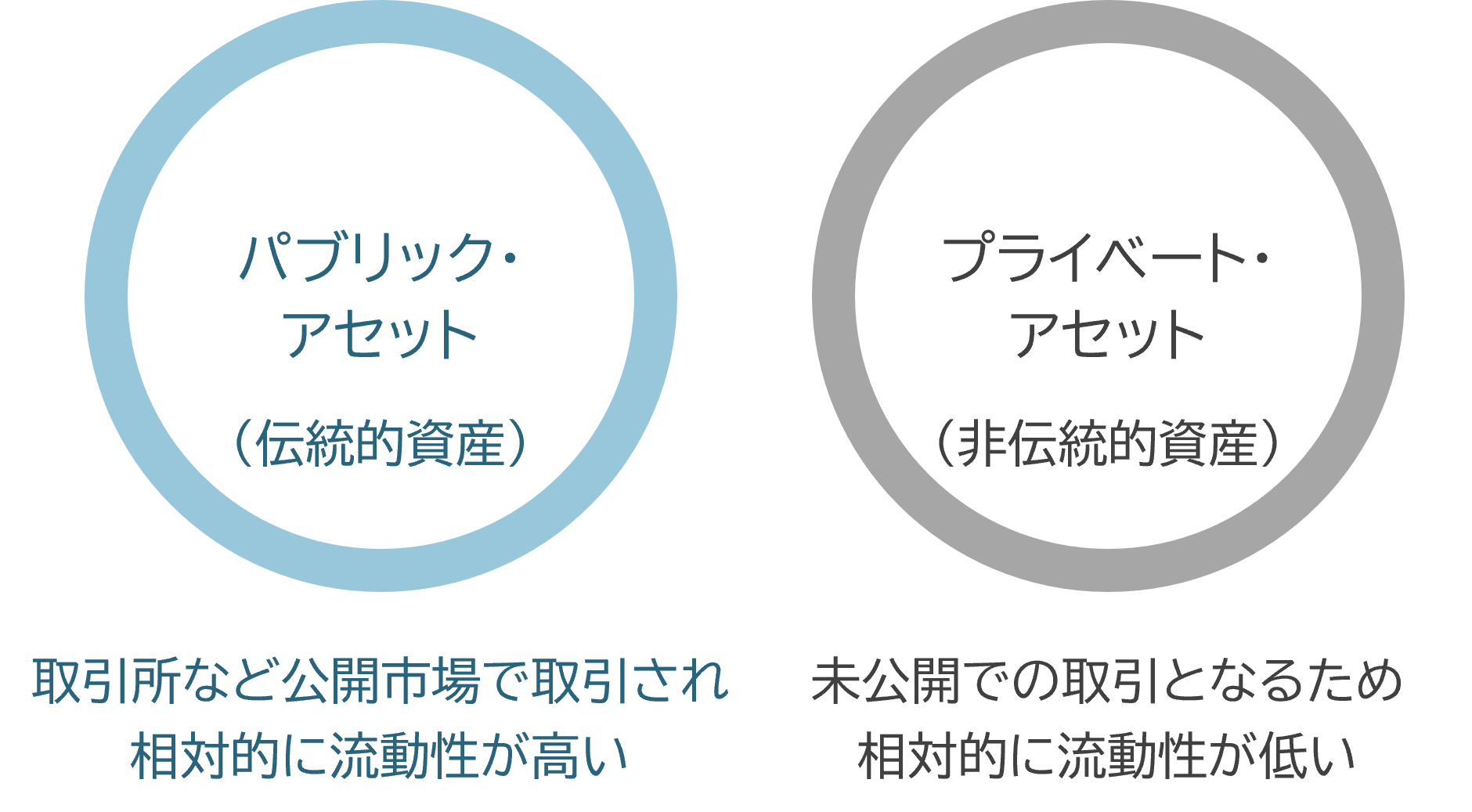 プライベート・アセットとは、証券取引所のような公開市場で取引されているパブリック・アセットに対して、プライベート(未公開)で取引される資産を指します。