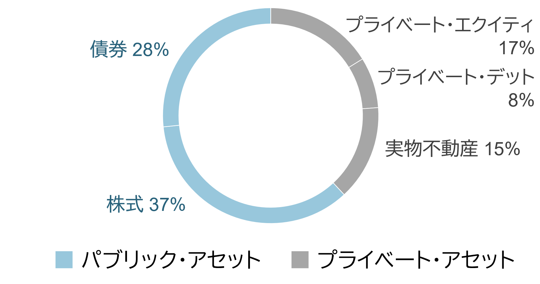 例えば、米国最大の公的年金基金であるカリフォルニア州職員退職年金基金(カルパース)は、「プライベート・アセット」を資産の4割程度とする目標を掲げています。