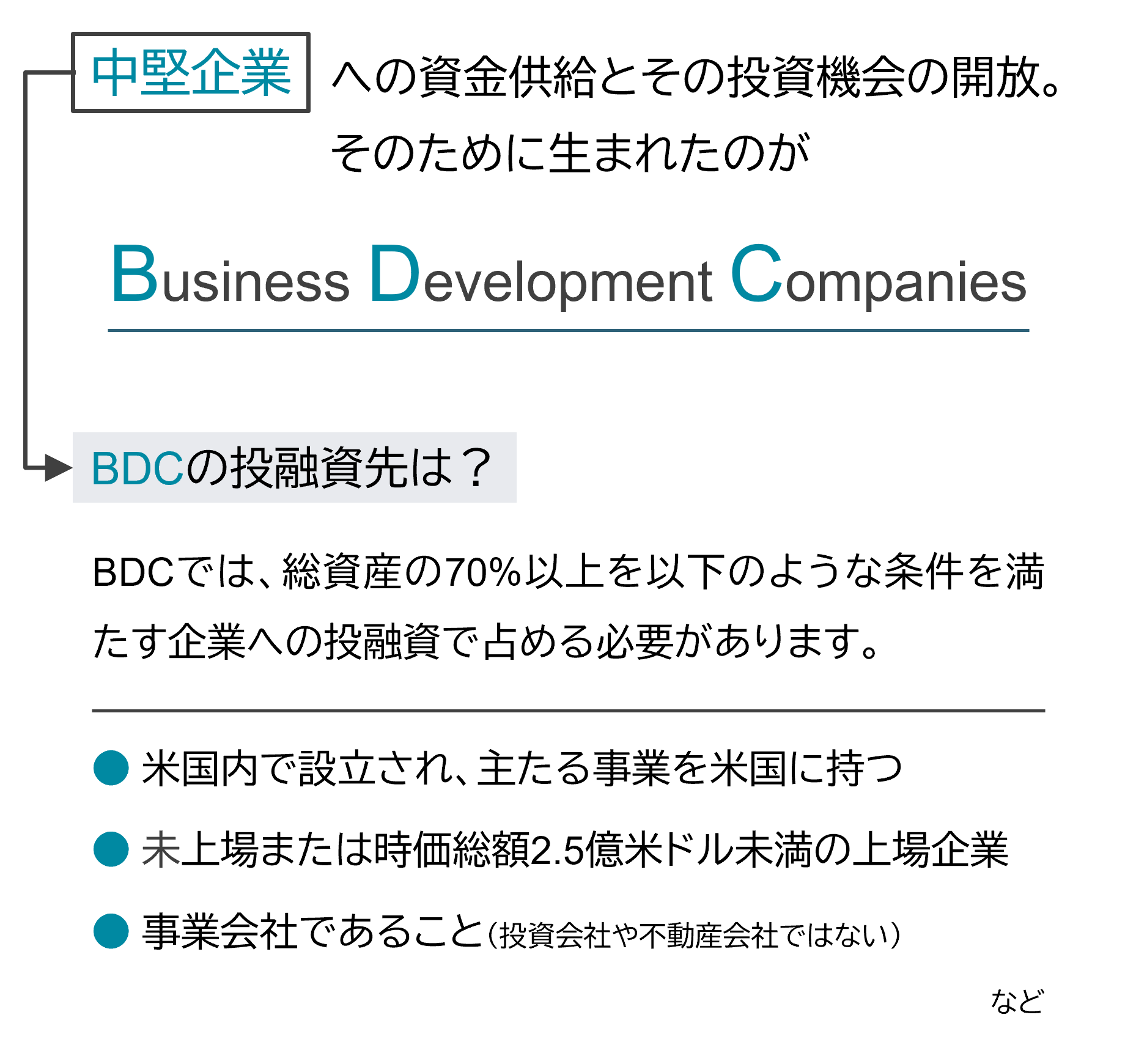 米国独自の企業形態であり、米国経済を支える中堅企業への資金供給を目的として、1980年に制度化されたのが、「BDC(事業開発会社)」。未上場の中堅企業が主な投融資先であることもあり、BDCはプライベート・アセットとしての側面を持つ資産と位置づけられています。
