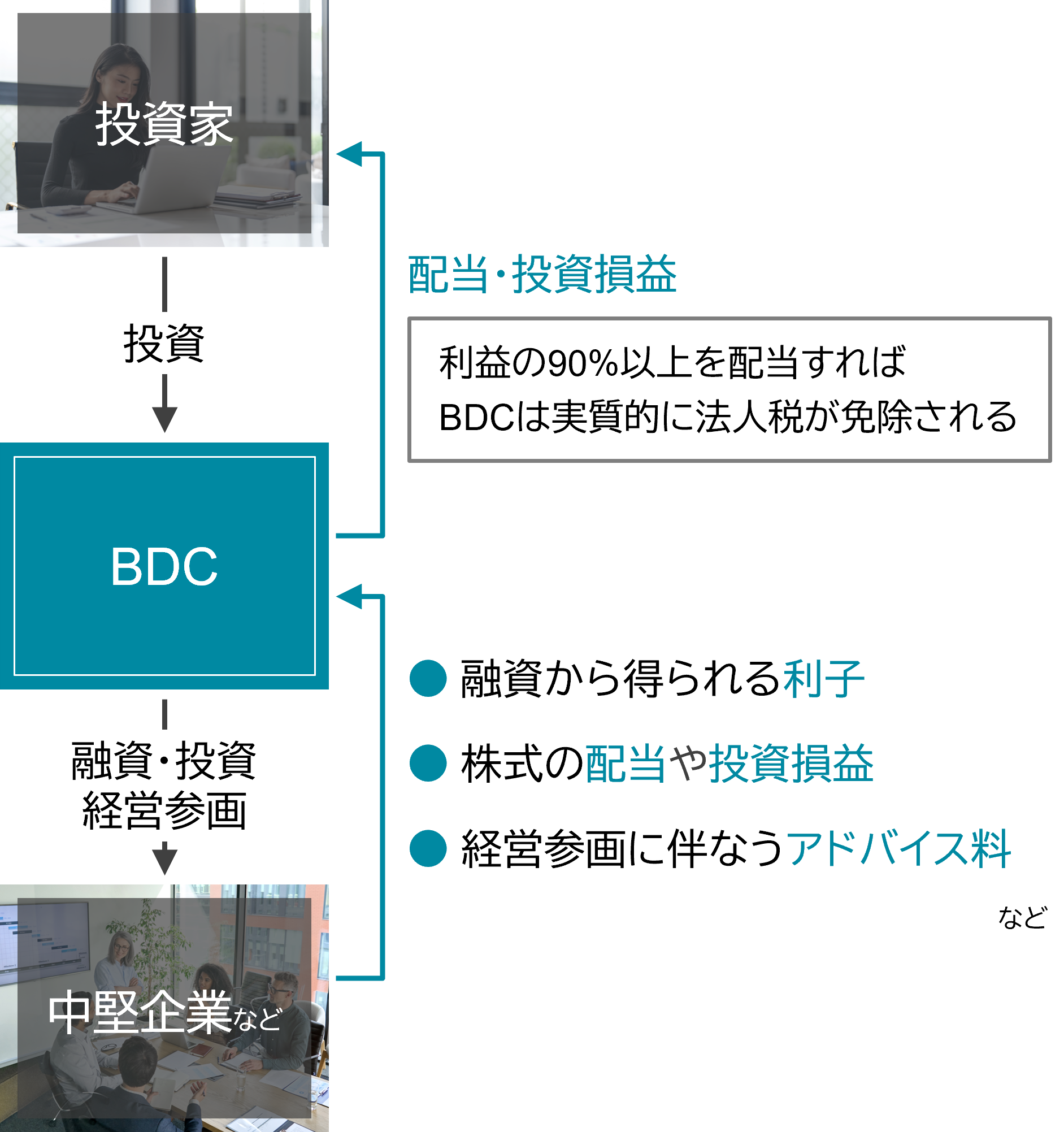 BDCは、主に米国の中堅企業への融資や投資、経営への助言などを通じて収益を得ています。そして、BDCの利益の大部分は配当として支払われているため、投資家はBDCを通じて実質的に米国の中堅企業に投融資をしているとみなすことができます。