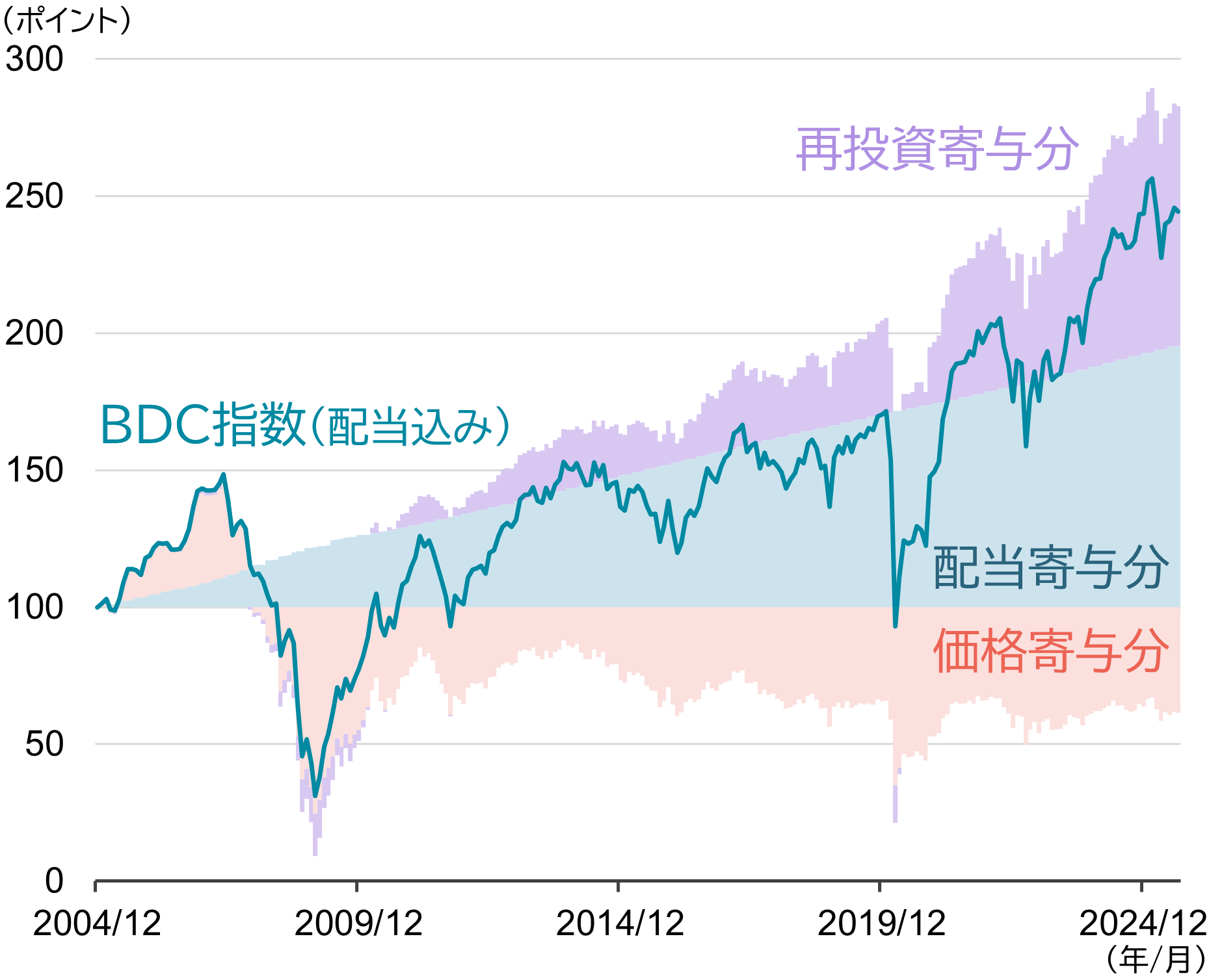●BDC指数:S&P BDC指数(ネット・トータルリターン)、価格寄与分:プライスリターン指数の累積、配当寄与分:「ネット・トータルリターン指数とプライスリターン指数のパフォーマンスの差分×プライスリターンの前月末値」の累積、再投資寄与分:ネット・トータルリターン指数から価格寄与分と配当寄与分を差し引いた値。