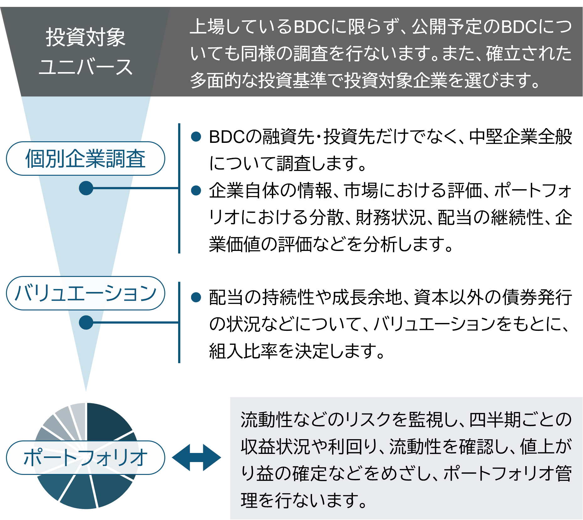 同社は、ボトムアップ・リサーチを通じ、継続可能な配当利回りや資本の状況、流動性などを評価し、資本の健全性とそれが生み出す高い利回りに注目して調査活動を行なっており、BDCの調査においてもその調査力が活かされています。
