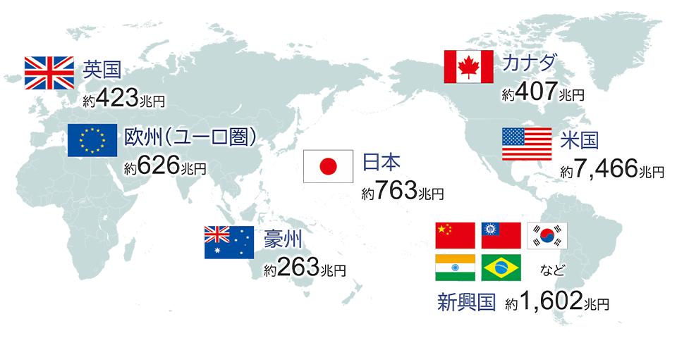 ※上記は、資料作成時点における主要投資対象国・地域の代表的な株価指数の時価総額(アモーヴァ・アセットマネジメントが円換算)を掲載しています。使用した指数は以下のとおりです。日本株式:TOPIX(東証株価指数)、米国株式:S&P500種指数、欧州(ユーロ圏):ユーロ・ストックス50指数、英国:FTSE100指数、カナダ:S&Pトロント総合指数、豪州:S&P/ASX200指数、新興国:MSCIエマージング・マーケッツ指数 ※投資対象国・地域は随時見直しを行ないます。※上記は、当ファンドについてのご理解を深めていただくためのイメージであり、実際の組入を保証するものではありません。※信頼できると判断したデータをもとにアモーヴァ・アセットマネジメントが作成。※上記は過去のものであり、将来の運用成果等を約束するものではありません。