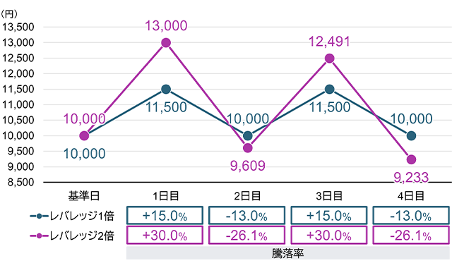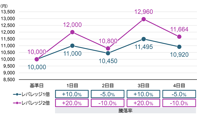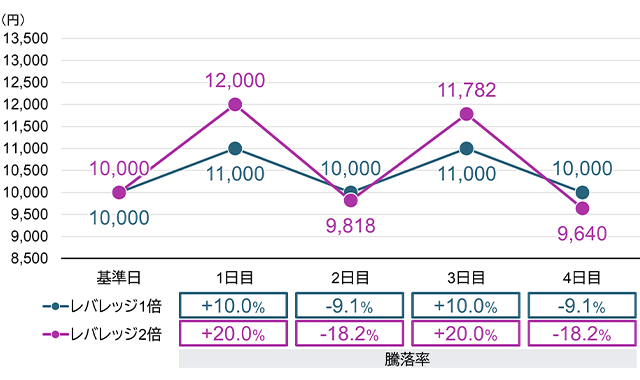 レバレッジを使うファンドは、商品特性上、日々の騰落率は基準となる指数の2倍や3倍になる一方、価格が上下動を繰り返すと長期の騰落率は基準となる指数の2倍や3倍よりも徐々に小さく(逓減)なります。ただ、特定の単一指数のみを対象として運用される一般的なブル・ベア型のレバレッジファンドに比べると、各ファンドにおけるその影響は軽減すると考えられます。 レバレッジを使う場合の値動きには、以下のような特徴があります。 ①レバレッジをかける指数の一定期間の騰落率がゼロであっても、価格が日々上下に動くことにより、レバレッジをかけた方の資産価格は劣後する。 ②日々の上下動が大きいほど、レバレッジをかけた方の資産価格はより逓減しやすい(こうした悪影響を「ボラティリティ・ドラッグ」といいます)。 ③レバレッジをかける指数の一定期間の騰落率がプラスの場合、一般的にレバレッジをかけた方の資産価格も上昇する。 また、各ファンドは、特定の株価指数の2倍の値動きをめざすような一般的なブル・ベア型ファンドとは異なり、米国株式と金(ゴールド)に分散投資を行なうレバレッジファンドです。米国株式と金は、異なる値動きをする傾向があるため、分散効果によって単一指数のレバレッジファンドに比べた逓減の影響は軽減されると考えられます。 ※「米国株式と金の相乗効果で基準価額は設定来高値圏に」では、S&P500指数と金先物およびTracers S&P500ゴールドプラスの月次騰落率についてご紹介しています。 ある資産に10,000円を投資した場合のシミュレーション 「4日間のリターン:0%/騰落率:中」の資産の場合 ![]() 「4日間のリターン:0%/騰落率:大」の資産の場合 ![]() 「4日間のリターン:プラス」の資産の場合 ![]() 上記では手数料や税金などは考慮していません。上記シミュレーションはレバレッジの効果をお伝えすることを目的とした参考情報です。 |