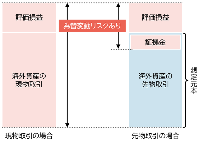各ファンドは、主に米国株式の現物と先物に加え、金先物に投資を行ないますが、保有する資産の一部は、為替変動の影響を受けます。 まず、米国株式の現物資産に投資する場合には、海外の取引所で株式の売買が行なわれるため、その投資金額(元本)については為替の変動による影響を受けます。 一方、株価指数先物や金先物といった先物取引を行なう場合には、「差金決済」という仕組みが使われます。これは、実際に資産を購入・保有するのではなく、価格の変動による損益だけをやり取りする方法です。そのため、為替の影響は、先物取引が実際にカバーする資産の金額(想定元本)ではなく、主に株価指数先物や金先物の「評価損益」と、担保として預け入れる現金(外貨建て証拠金)に限定されます。 取引による為替変動リスクの違いのイメージ ![]() |