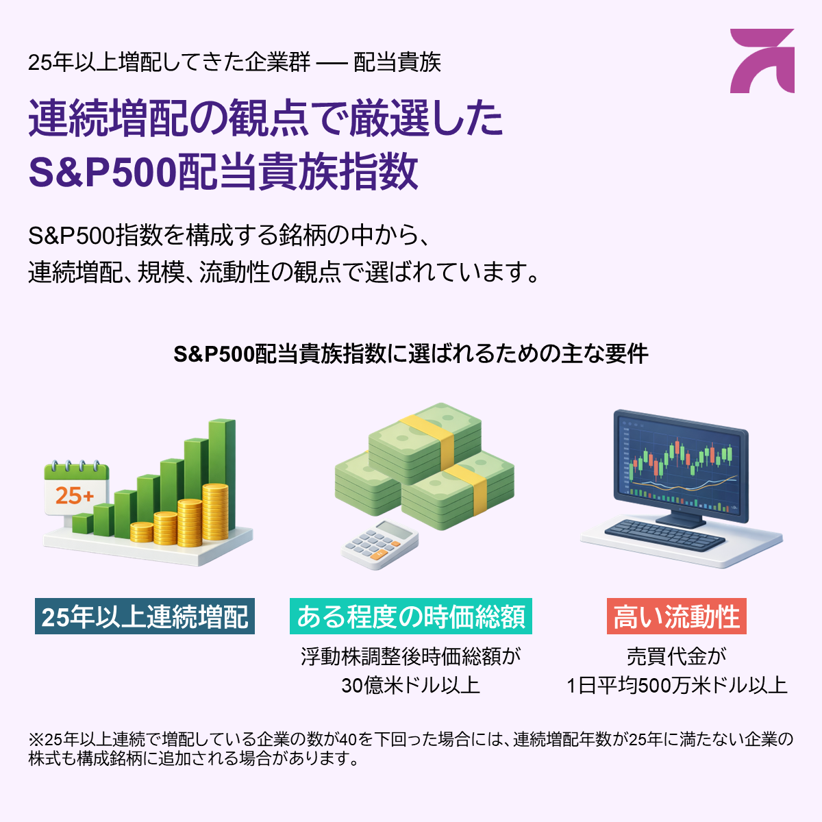 「S&P500配当貴族指数」は、「S&P500指数」の構成銘柄のうち、25年以上の連続増配をしてきた企業で構成された指数。