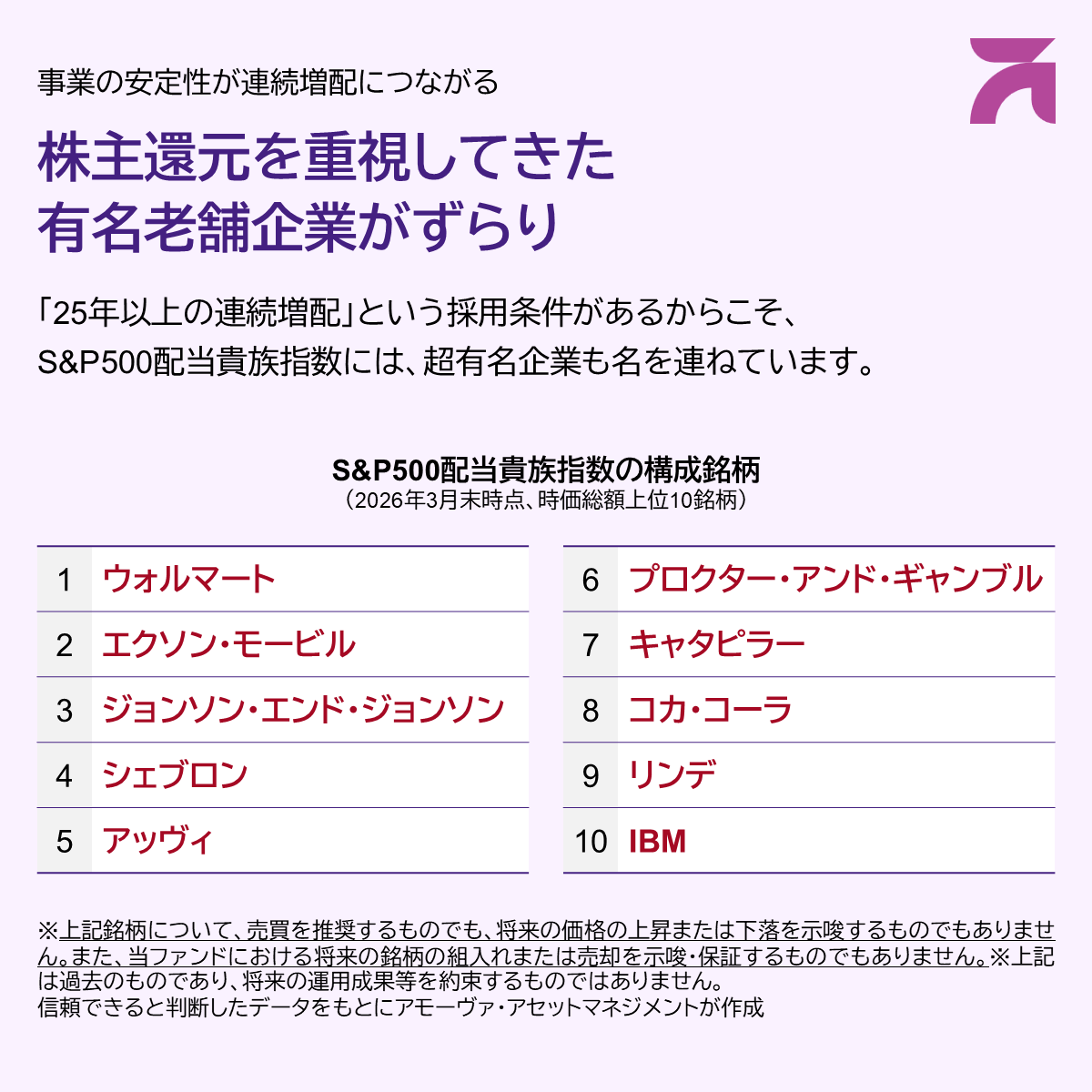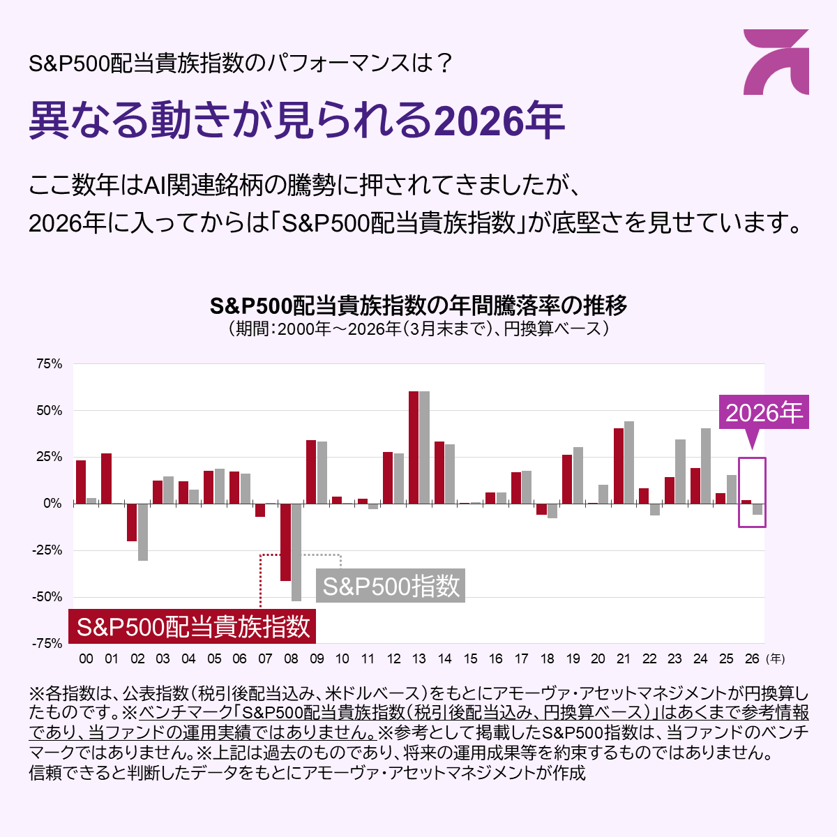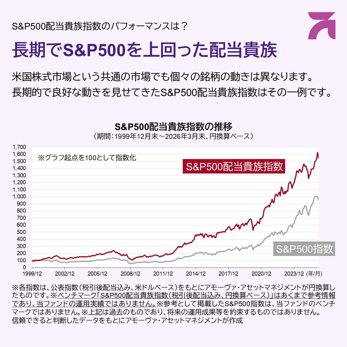 S&P500配当貴族指数はS&P Dow Jones Indices LLCまたはその関連会社(「SPDJI」)の商品であり、これの使用ライセンスがアモーヴァ・アセットマネジメント株式会社に付与されています。S&PⓇ、S&P500Ⓡ、US 500、The 500、iBoxxⓇ、iTraxxⓇおよびCDXⓇは、S&P Global, Inc.またはその関連会社(「S&P」)の商標です。Dow JonesⓇは、Dow Jones Trademark Holdings LLC(「Dow Jones」)の登録商標です。これらの商標の使用ライセンスはSPDJIに付与されており、アモーヴァ・アセットマネジメント株式会社に対し一定の目的でサブライセンスされています。当ファンドは、SPDJI、Dow Jones、S&P、それらの各関連会社によって後援、推奨、販売、または販売促進されているものではなく、これらのいずれの関係者も、かかる商品への投資の妥当性に関するいかなる表明も行わず、S&P500配当貴族指数のいかなる過誤、遺漏、または中断に対しても一切責任を負いません。