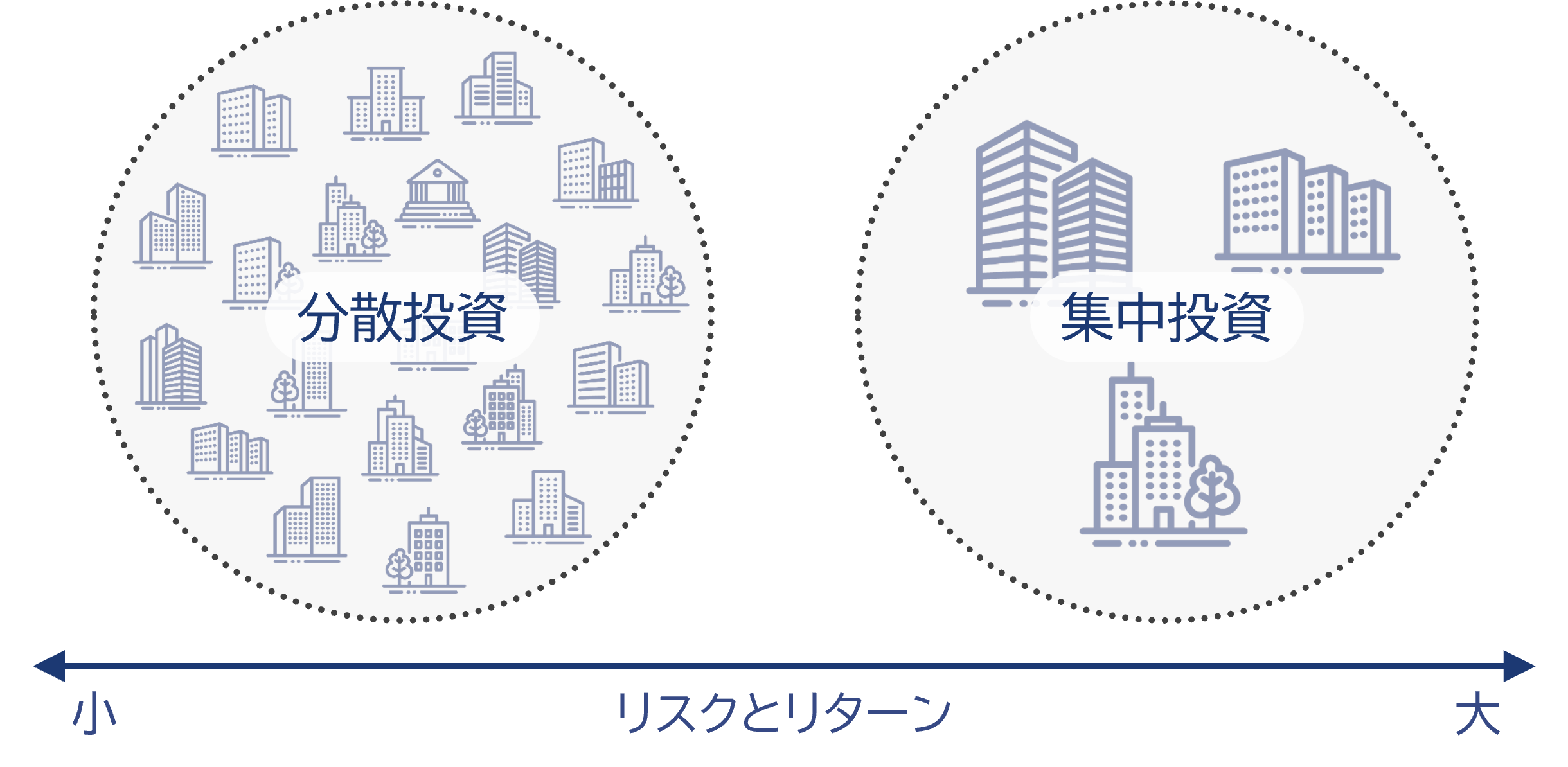 ※上記はイメージです。集中投資に比べて、分散投資のリスクとリターンは小さくなるとされていますが、あくまでも相対的なものであり、投資対象資産によりリスクとリターンの水準は異なります。