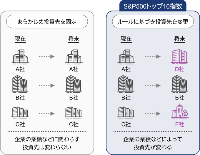 時代の変化とともに、主役となる企業は入れ替わりますが、投資先を固定すると、この変化を見過ごし、成長機会を十分に捉えられない可能性があります。S&P500トップ10指数は、毎年6月に構成銘柄を見直すルールを採用しており、市場環境や時代の変化を反映させる仕組みを持っています。